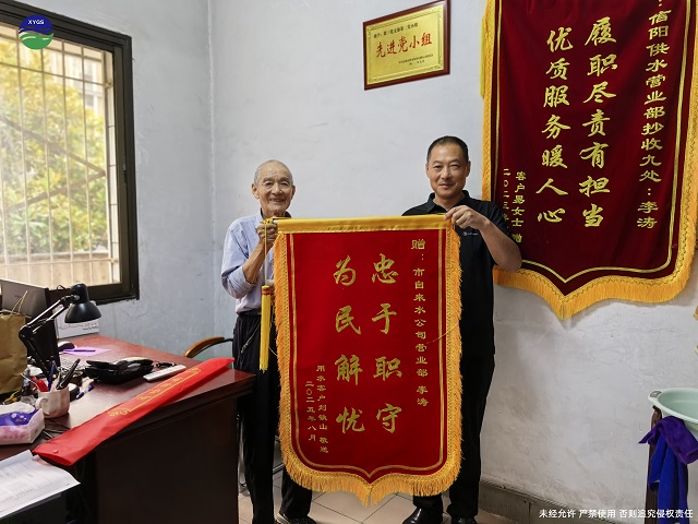 等聯系維修師傅處理好漏水點,已經是下午兩點。老人看著李濤濕透的汗衫,又摸了摸他曬得發紅的胳膊,轉身從冰箱里端出一碗冰鎮綠豆湯,硬要塞給他:“孩子,你真是把我的事放在心上啊!要不是你,我這水費得白交多少,墻還得泡壞嘍!”李濤擦了擦汗,笑著把湯推回去:“大爺,這是我該做的。您記著,以后有啥用水問題,直接給我打電話!”他指了指胸前的黨徽,“我是黨員,守著這片區,就得讓大家伙兒用水踏實。”為了感謝抄表員李濤負責、熱心的工作態度,老人先寫了一副書法送來表達對李濤同志的感謝,又冒著大雨送了一面“忠于職守 為民解憂”的錦旗。
